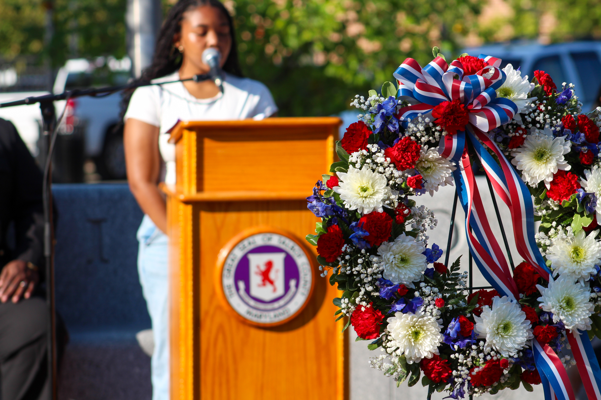 Ta’Vea Roberts, student at Easton High School, sings “America the Beautiful” behind the memorial wreath.