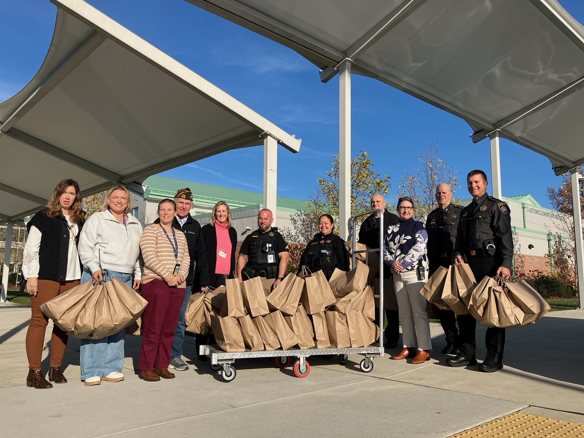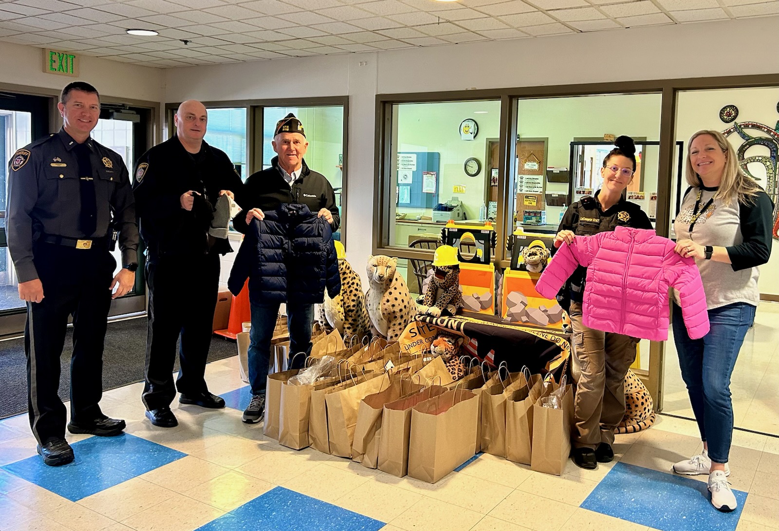On Monday, November 25, 2024, VFW Post 5118 Commander Kenley Timms and Talbot County Sheriff Joe Gamble, assisted by uniformed deputies, delivered 124 gift bags filled with new winter coats, hats and gloves for students at Easton Elementary School, Chapel District Elementary School, White Marsh Elementary School and Polaris Village Academy.